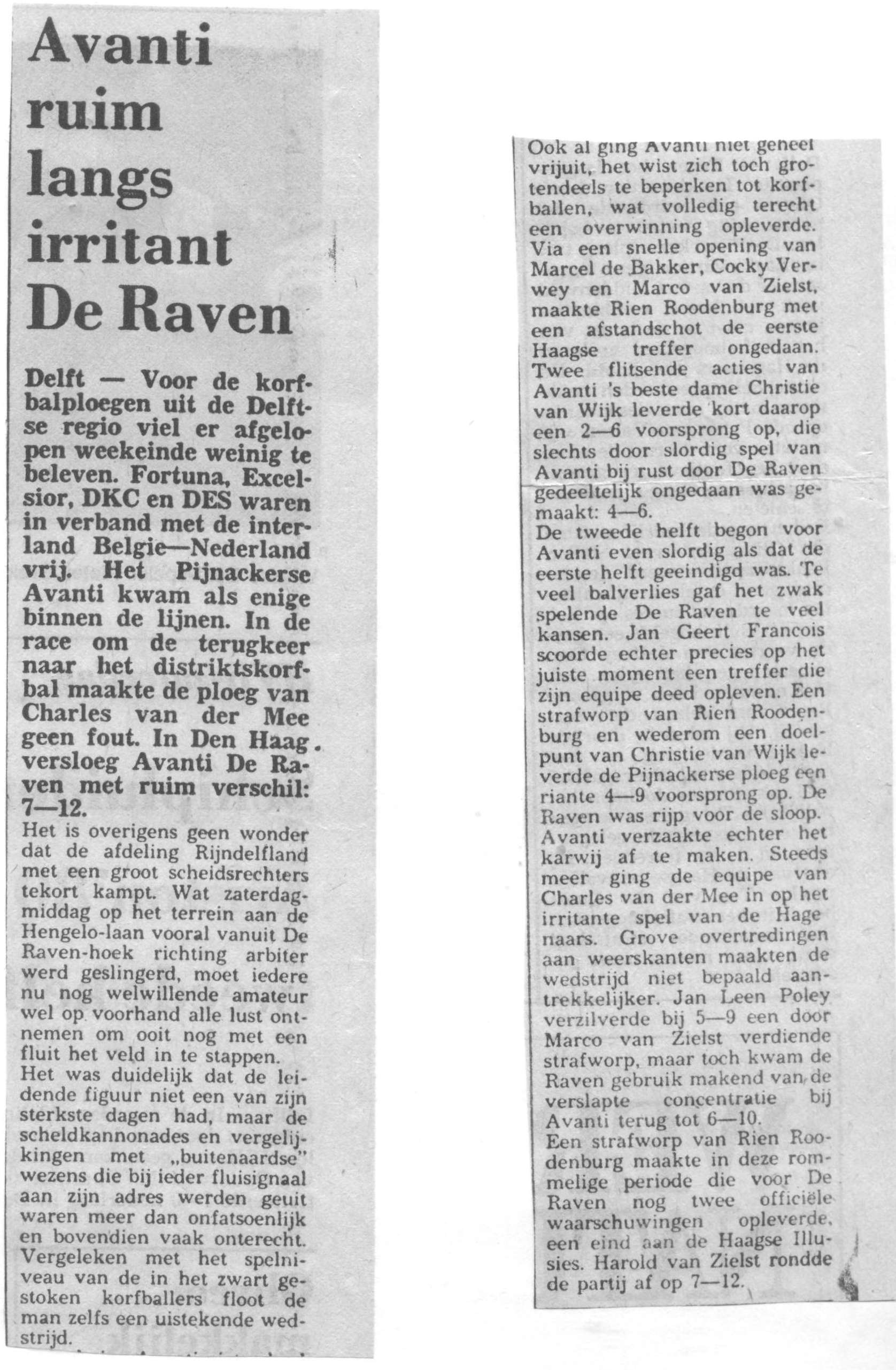| 0' Niet bekend De Raven(5 - 7) 0' Afstand (3e doelpunt)Christie van Wijk(5 - 8) 0' Niet bekend De Raven(6 - 8) 0' Strafworp Jan Leendert Poley(6 - 9) 0' Niet bekend De Raven(7 - 9) 0' Niet bekend (2e doelpunt)Jan-Geert Francooijs(7 - 10) 0' Tekst Erik Blijleven komt in het veld voor Jan-Geert Francooijs 0' Strafworp (2e doelpunt)Rien Rodenburg(7 - 11) 0' Afstand Harald van Zielst(7 - 12)